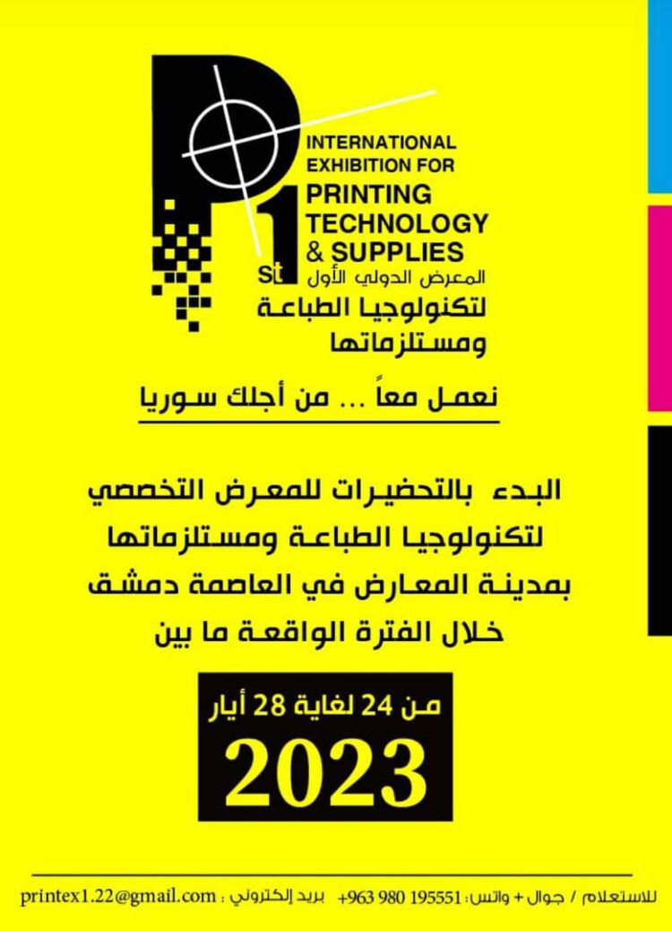 في ٢٤ من أيار القادم على أرض مدينة المعارض، وقال العطار إن المعرض هو الأول من نوعه في مجال الطباعة لجهة التقينات الحديثة التي سيتم عرضها بإشراف كبرى الشركات، هذا بالإضافة إلى حجم المشاركة الدولية المتوقعة وخاصة دول الجوار ومنطقة الخليج العربي.